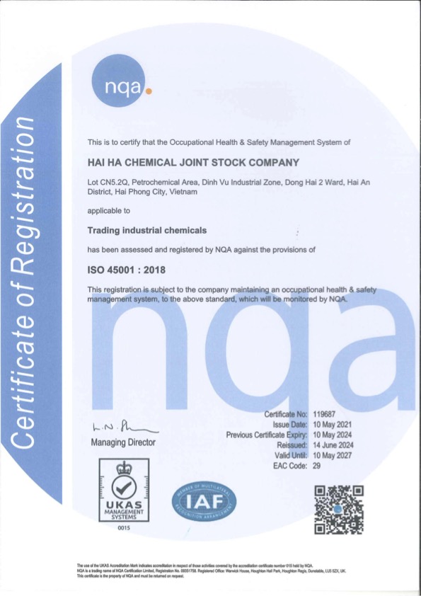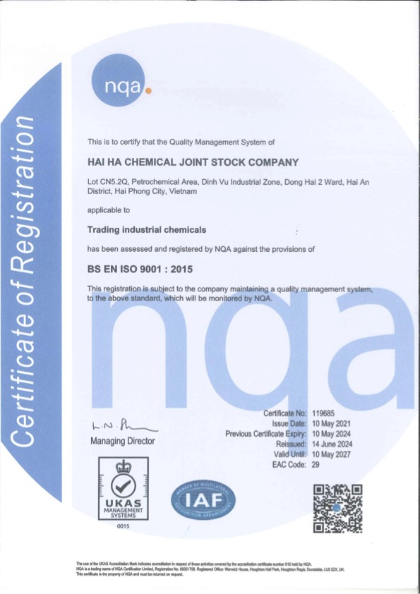 Công ty Cổ phần Hóa chất Hải Hà tự hào là doanh nghiệp đạt ba chứng chỉ ISO quốc tế gồm:
